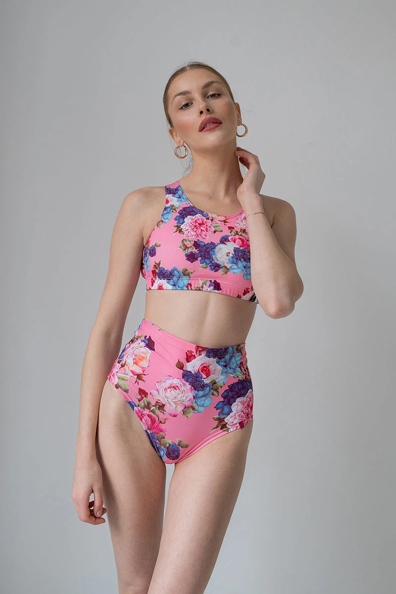 Classic high waist shorts in a bold botanical print. Matched here with the Openback Top – Peony.